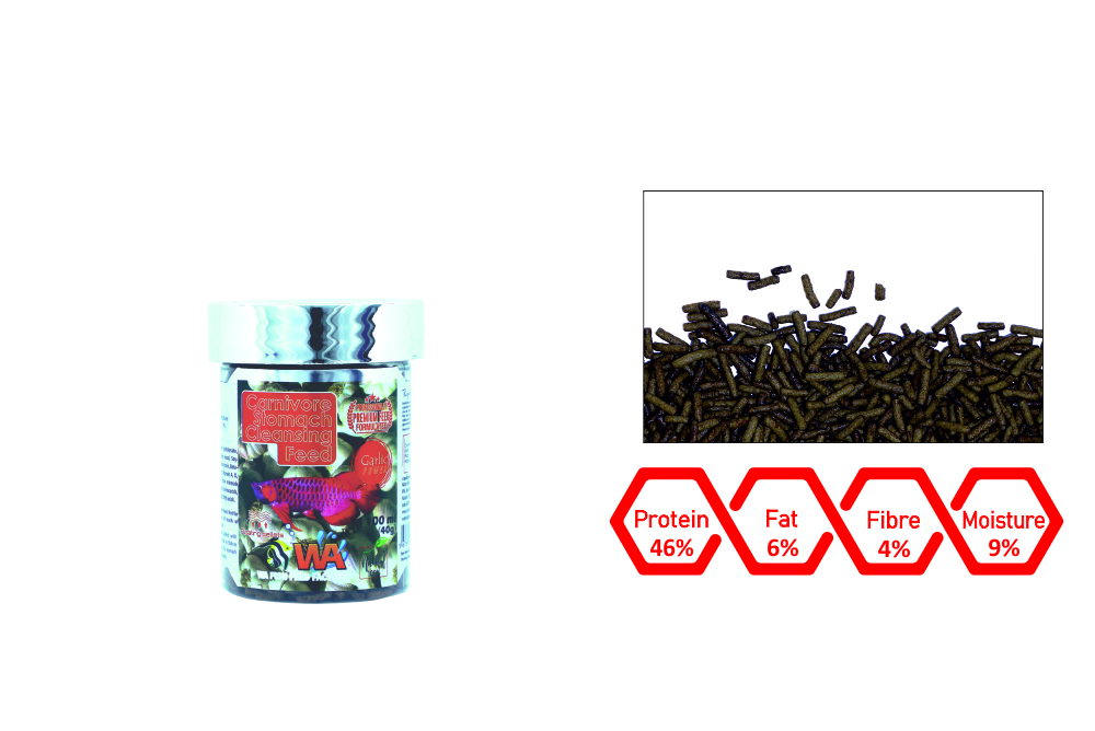 Carnivore stomach cleansing feed added with concentrated garlic extract to be fed to fish as weekly once or twice to cleanse the stomach for better digestion and improved health.