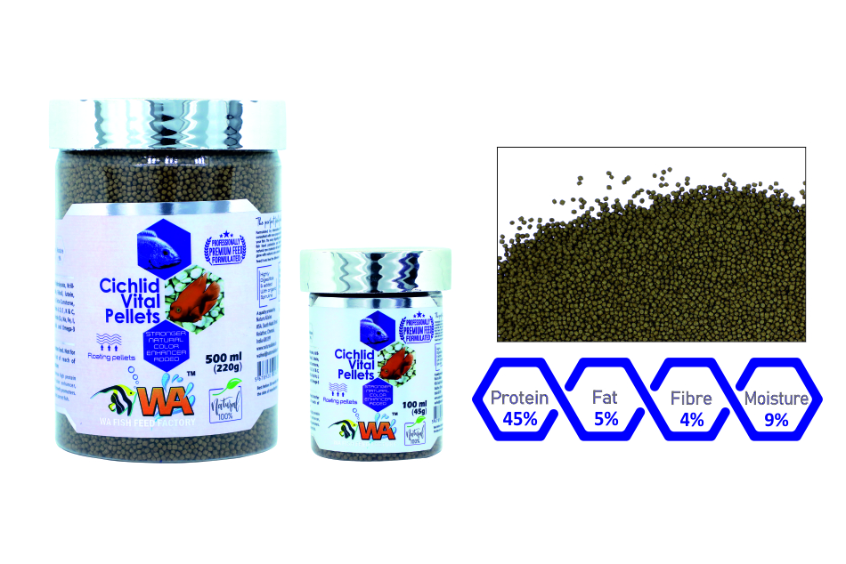 Cichlid Vital Pellet is an omnivorous high protein fish feed, formulated with color enhancer, immunity booster and natural growth promoters. Best choice for african cichlids, and parrot fish.