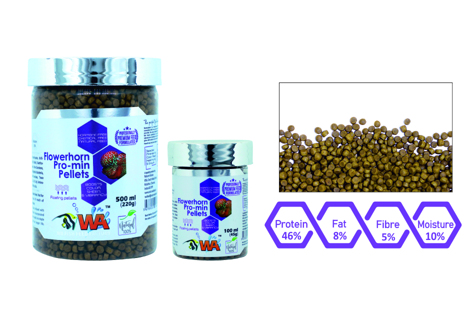 Pro-min is a staple feed but also infused with natural color enhancers. Pro-min incorporated with active minerals to improve health. As staple diet Pro-min can be fed daily for longer life.
