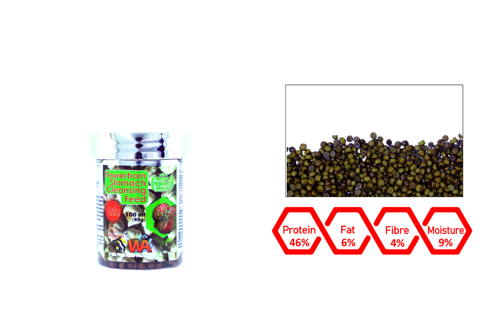 Flowerhorn stomach cleansing feed added with concentrated garlic extract to be fed to fish as weekly once or twice to cleanse the stomach for better digestion and improved health.